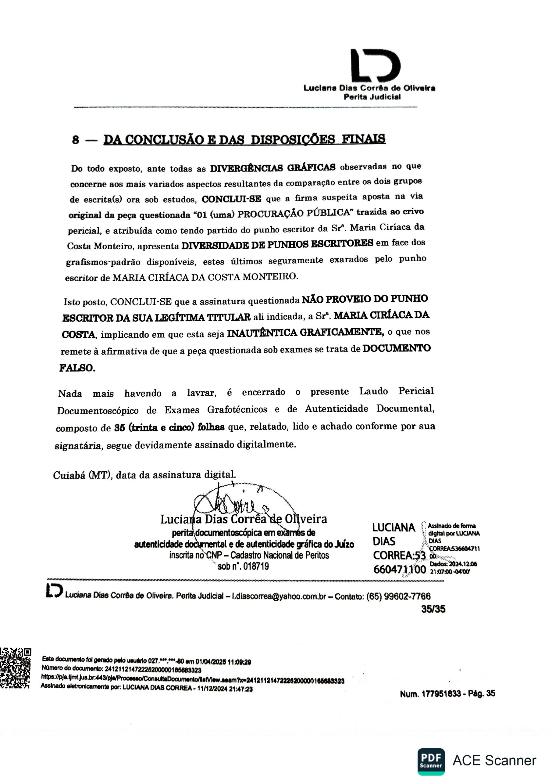 Na sua análise, a perita Luciana estudou toda a documentação do processo, fez visitas aos terrenos reivindicados e consultou os arquivos de procurações registradas no 6º Ofício Notarial e de Registro de Imóveis de Cuiabá. A perita concluiu que houve fraude e falsificação na assinatura de uma procuração que deu origem às escrituras apresentadas por Stieven Pinho e Schevinski, para sustentarem a pretensa posse da área em disputa.
